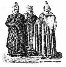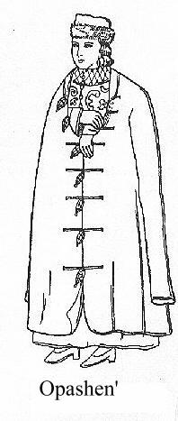 As mentioned earlier, both men and women wore odnoriadki, unlined loose coats with long sleeves, and opashni, (sing. - opashen'), similar in cut to odnoriadki but with lightweight lining. Men also could wear an okhaben’ or opashen' - odnoriadka with a large fold-down square collar. Okhabni were sometimes worn over the shoulders, like mantles, and had long, thrown back sleeves with underarm slits. (Rabinovich, p. 76, Giliarovskaia, p. 71.) Men wore the actual mantles or capes, privoloki, as well. This garment, along with odnoriadka and opashen, is described in the women's clothing section, together with shuby, the fur-lined coats worn by men in the winter.