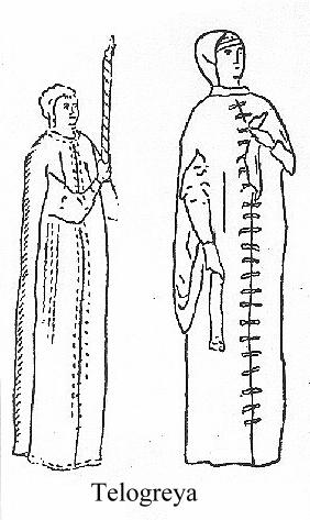 Telogreya was a button-front dress similar in construction to shubka, and, according to Rabinovich (p. 75), was often worn over it or over some other sarafan. Telogreya always had sleeves, either arm length and narrowing to the wrist, or very long with arm slits at the top. It was very long, down to the heels, and very wide, about 425 cm at the hem (Giliarovskaia, p. 98). Telogrei usually had a great many buttons (or at least ties), up to 24, which were usually not done all the way. They were extremely dressy, made of heavy silks, brocades, satins, and velvets, and adorned with gold lace (usually not made from gold thread but made by jewelers from metal) and other fancy trimmings. First mention of a telogreia is found in Kurbsky’s letter to Ivan the Terrible, in the middle of XVIth century (Rabinovich, p. 76). |